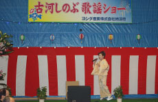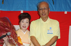 当社の小林社長から、古河しのぶさんに花束贈呈です。朝から、あっちこっちと走り回っていた社長ですが、暑さをものともせず元気いっぱいにステージに登場しました。